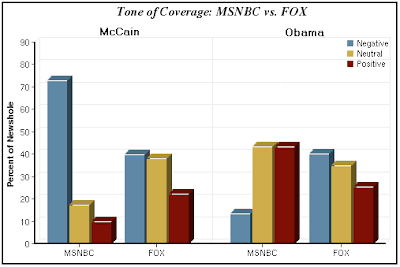 "Statistically, the biggest difference is how little negative coverage there is of Obama on MSNBC versus the press generally. On Fox, the biggest variance is how much more positive coverage there is of McCain than elsewhere.